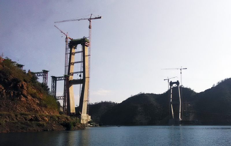 红水河特大桥两侧桥墩高度均为210米,每个桥墩的起重机械配置均为hth华体网页版登录入口,华体(中国)生产的一台C7036塔机、一台C7030塔机和两台SC200/200WPZ中速变频施工梯,副墩的施工机械为一台P125平头式塔机。 承担主施工吊装作业的C7036塔机,最大起重量16吨,工作幅度为70米,C7030塔机最大起重量16吨,起升高度为220米,工作幅度为50米,两台塔机交叉式布置,覆盖面大,C7036塔身断面2.5米,主弦为圆钢,C7030塔身断面2米,主弦为角钢,机构配置均采用变频无级调速系统,启动、制动平稳。