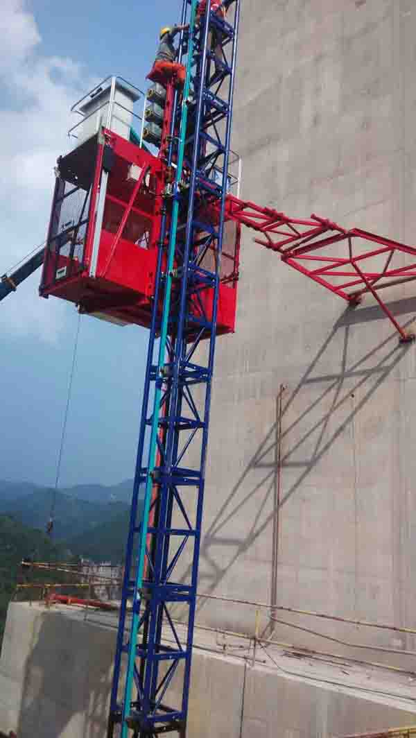 用于载人和提升物件的两台施工升降机配置高度均为248米,3×15kW三电机驱动,额定提升速度0~55 m/min,电缆形式采用滑触式,解决了超高施工升降机的电缆自重负荷问题。