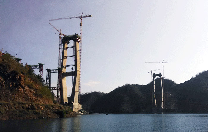 红水河特大桥两侧桥墩高度均为210米,每个桥墩的起重机械配置均为hth华体网页版登录入口,华体(中国)生产的一台C7036塔机、一台C7030塔机和两台SC200/200WPZ中速变频施工梯,副墩的施工机械为一台P125平头式塔机。
